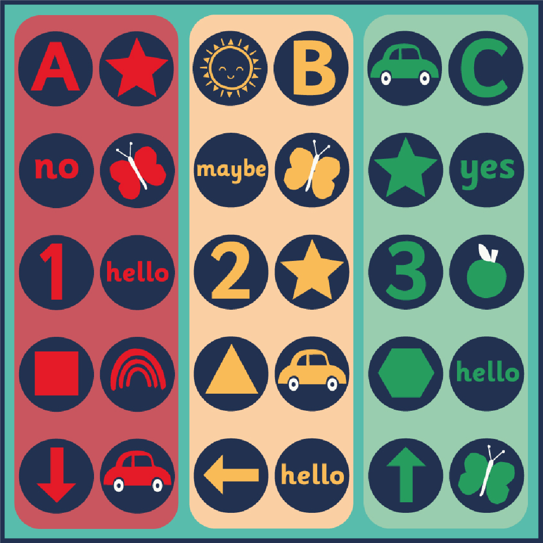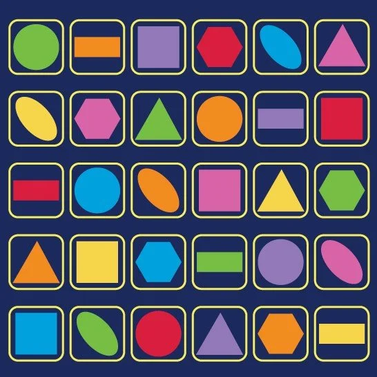 3 metre square placement carpet with clearly identifiable seating areas for up to 30 children. The brightly coloured basic shapes aid shape and pattern identification.