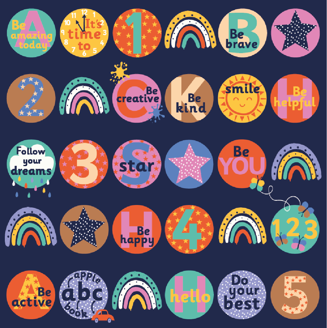 3 metre square placement carpet with clearly identifiable seating areas for up to 30 children. The brightly coloured designs include positive saying and messages to enhance and reinforce wellbeing throughout the classroom.