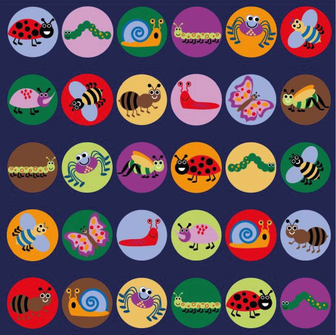 3-metre square placement carpet with clearly identifiable seating areas for up to 30 children. The brightly coloured mini beasts include a caterpillar, snail and ladybird.